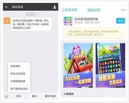 在更早的3月31日,腾讯就悄悄地在微信上试水另1款H5游戏——天天爱消除。游戏入口放在微信的“微信游戏”公众服务号底部的菜单栏中的一个子菜单“免费下载试玩”。点击这一选项之后,就可以看到《天天爱消除网页版》的试玩界面。