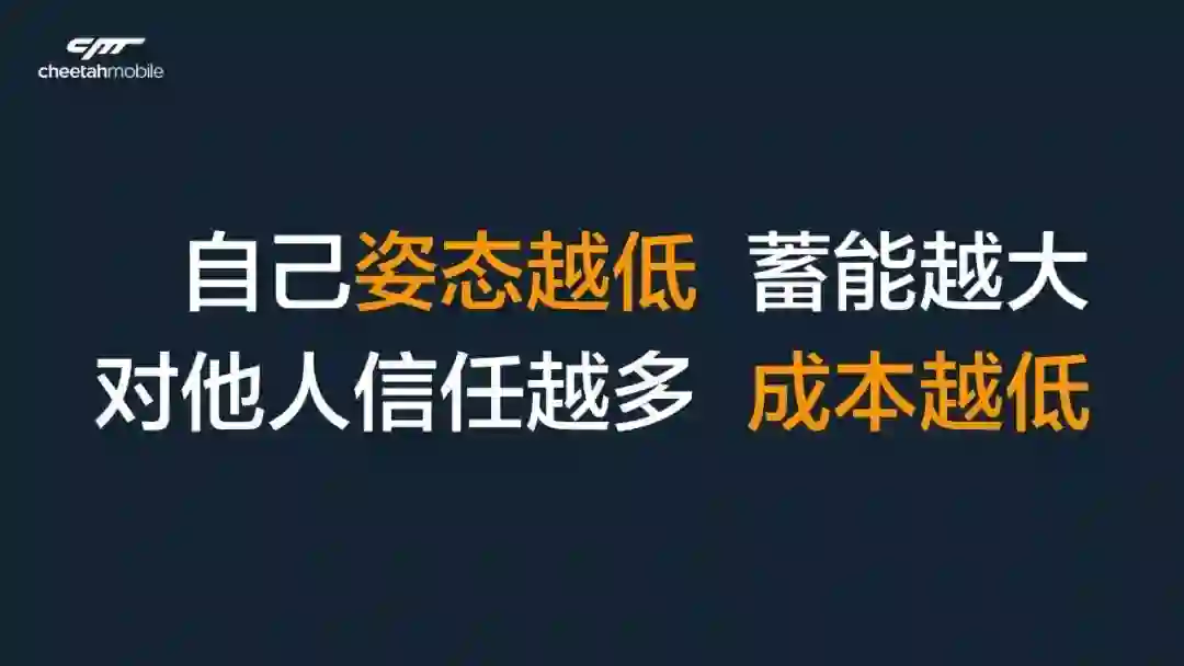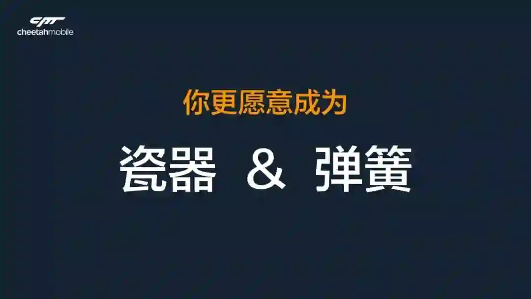 猎豹过去七年,尤其2017年,团队的成长,变化很多。我希望,我们能成为弹簧一样的人。把所有压向你的困难、遭遇的失败,都变成自我吸收的一种机会,一种途径,一种养分。