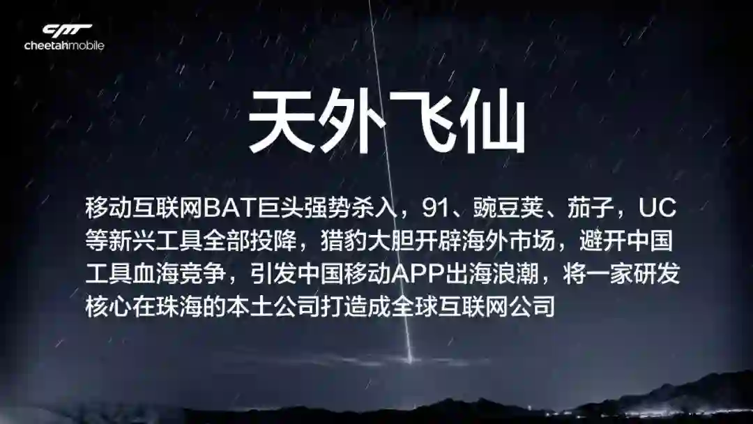 很多人,可能从未想过,我们能从一个总部在珠海这么一个小渔村走出来,变成了一家全球化的美国上市科技公司。也正因为这一招天外飞仙,才有了猎豹今天全球化业务的基础。