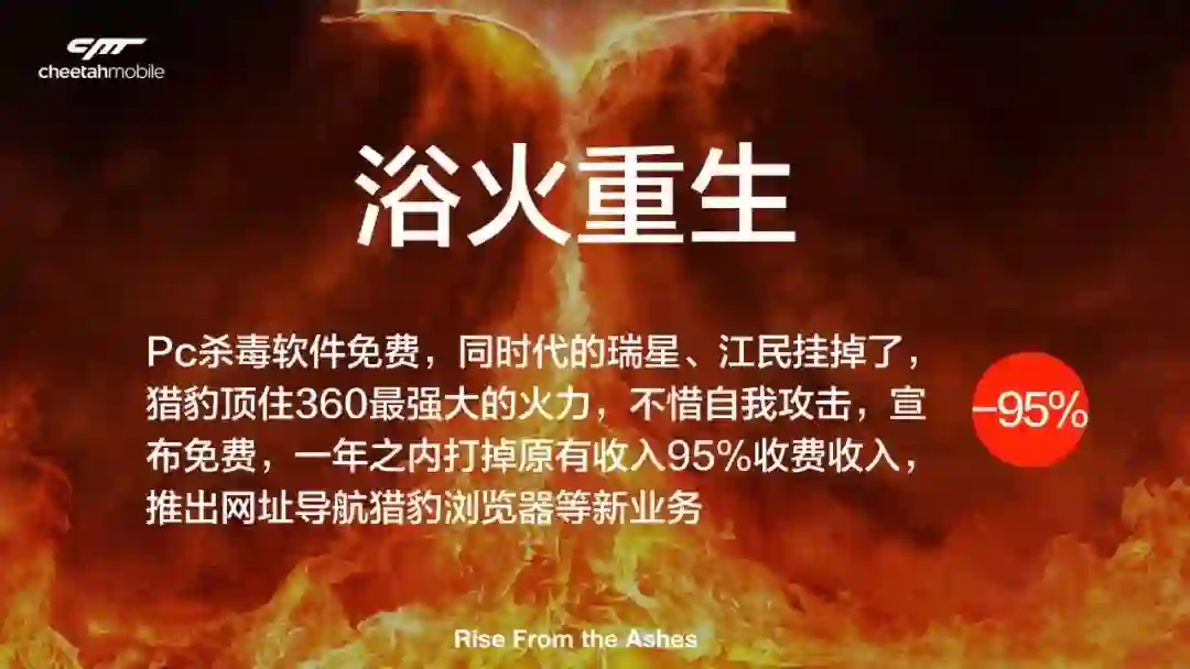 PC安全时代,我们当时还叫金山毒霸,同时代的竞争对手有瑞星、江民、卡巴斯基以及后起之秀360。猎豹作为其中一支并不算强大的队伍,顶住了360最强火力,不惜自我攻击,宣布全网免费。一年之内,打掉存量收入95%,推出新业务:网址导航和猎豹浏览器。