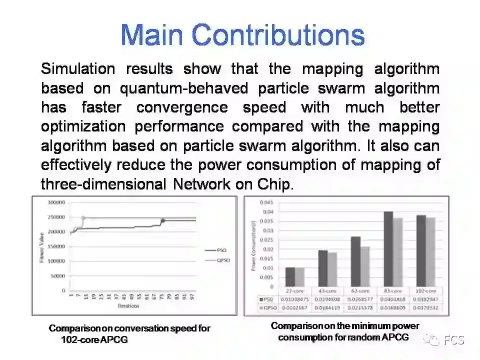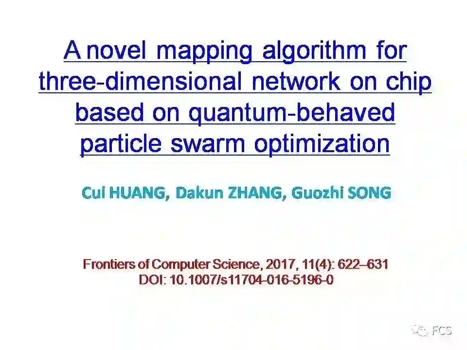 本文介绍了 3D NoC 的基本概念和相关研究工作,将量子行为粒子群优化(QPSO)算法首次运用于 3D NoC 映射优化问题中。仿真结果表明,基于 QPSO 的映射算法与基于粒子群优化(PSO)的映射算法相比,收敛速度更快、优化性能更好,并且还可以有效降地低 3D NoC 映射的功耗。