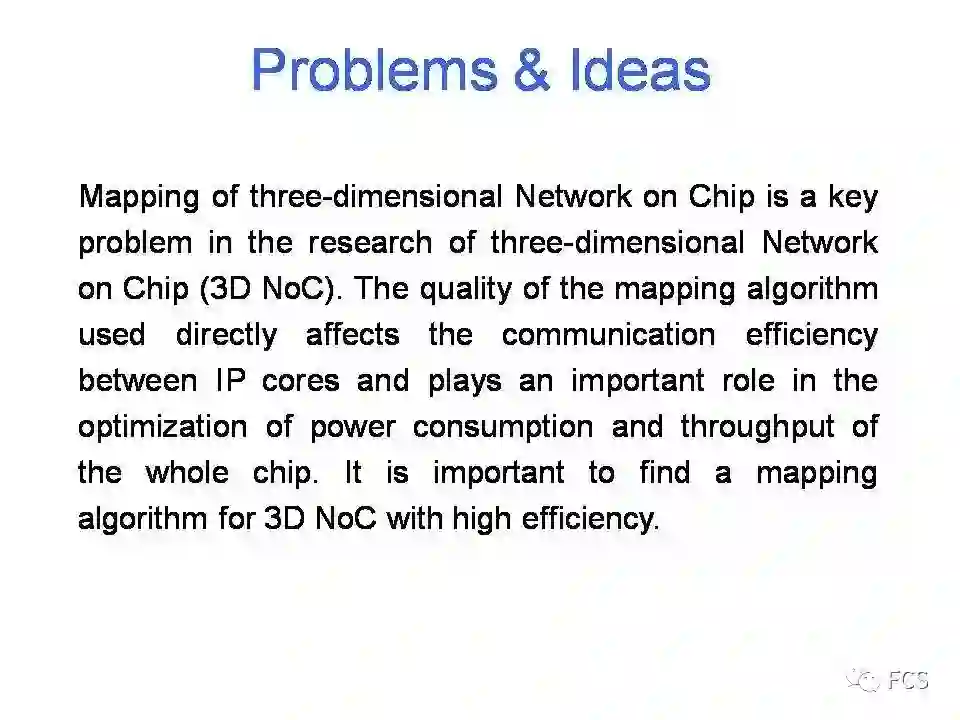 三维片上网络(3D NoC)映射是 3D NoC 研究领域的重要课题。映射算法的质量直接影响IP核之间的通信效率,并对整个芯片功耗和吞吐量等优化起着至关重要的作用。