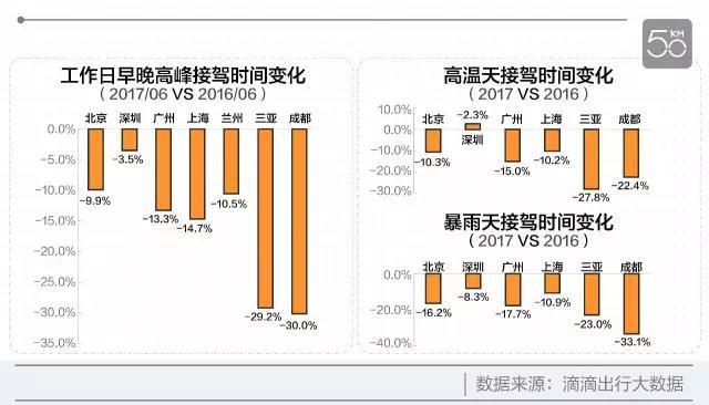 滴滴出行大数据显示,对比2016年,滴滴接驾平台运营效率整体均有明显提升。通过“接驾时间”变化可以看出,无论是在通勤时间段还是高温和暴雨天,在几个核心城市,滴滴出行平台的运营效率均有大幅提升。