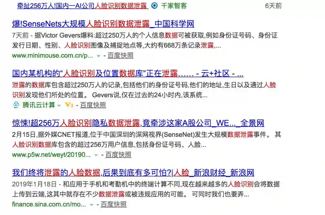 基于“微博安全应急响应中心”的消息,“大规模人脸信息数据泄露”的国内报道甚喧尘上,目前百度上搜索相关词条已达到190万。