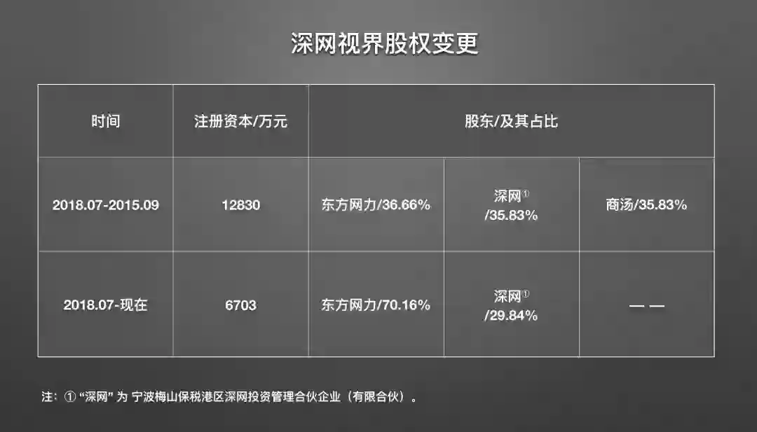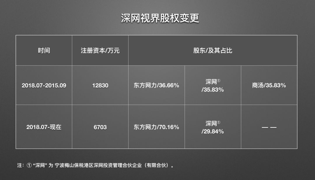 根据历史工商信息显示,深网视界的股东在2018年7月20日进行过一次变更:占比35.83%的股东之一北京商汤科技开发有限公司撤回4597万出资,其他两大股东“东方网力”和“宁波梅山保税港区深网投资管理合伙企业(有限合伙)”出资额基本保持不变,分别为出资4703万,占比70.16%;出资2000万,占比29.84%。