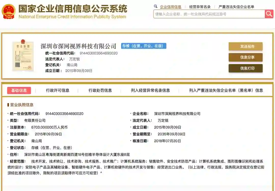 在国家工商信息页面中,深网视界的经营范围包括,技术开发、技术转让、技术咨询、技术推广、技术咨询、技术服务、技术推广;计算机系统服务;销售软件、安全技术防范产品;计算机系统集成、图形图像识别和处理系统的设计;安防电子产品及其辅助设备、智能硬件电子产品、计算机软硬件的技术开发与销售;经营进出口业务。(标红信息为2018年1月信息变更后新增项目)