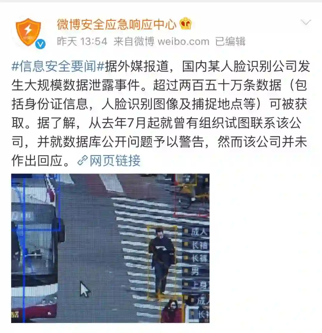 随后,基于国内为数不多的信源之一——“微博安全应急响应中心”微博——的相关报道席卷而来,而在这些报道中,泄露的信息描述中无一例外都包括了“人脸识别图像”信息,部分报道还将其作为标题信息。