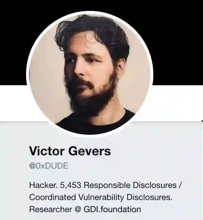 在个人Twitter页面,Victor Gevers在个人介绍一栏说道,一名黑客,主导/参与了5453起漏洞事件的披露,目前为GDI基金会的研究员。