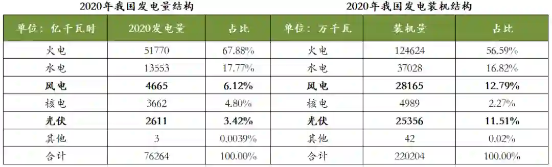 从2020年我国的电力供应结构来看,目前清洁能源发电量在我国总发电量占比为32%,其中光伏与风电合计占比仅不到10%;从装机量来看,清洁能源装机占比43%,其中光伏与风电合计装机量为24.31%。综合来看,目前我国清洁能源发电仍然以水电为主,光伏和风电的实际渗透率处于较低的水平。