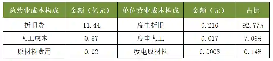 成本端:光伏电站为重资产运营,且基本不需要投入原材料,因此光伏电站的营业成本主要由固定资产折旧构成。以太阳能为例,截止2021年中报,太阳能固定资产总投入额已经达到332.57亿元,其中光伏组件等发电设备294.38亿元,房屋及建筑物17.95亿元。在巨大的固定资产投入额之下,每年由光伏组件和土地资源产生的固定资产折旧费就成了企业最主要的成本来源,如下表所示,2020年,太阳能折旧费用高达11.44亿元,度电折旧占比为92.77%。