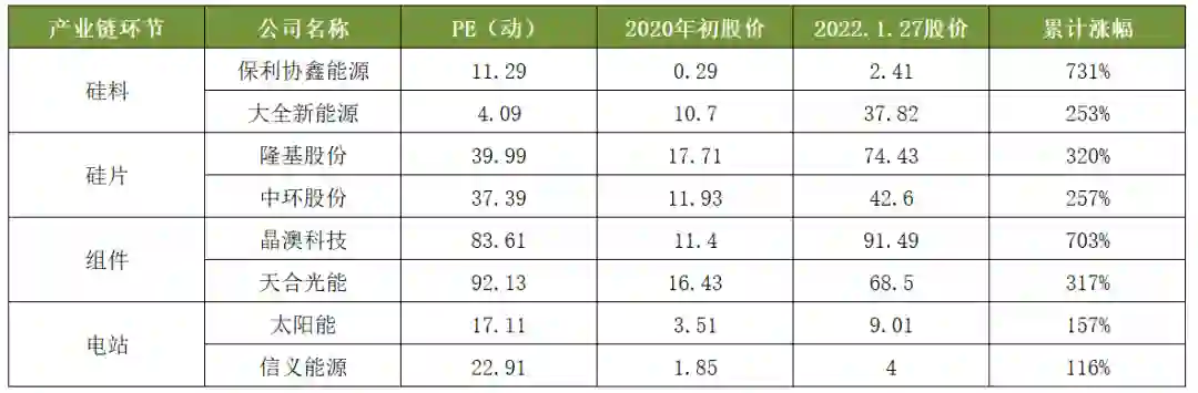 对比光伏产业链各环节龙头企业的估值以及累计涨幅情况,我们可以发现:除了目前处于周期高点的硅料环节估值偏低以外,相比其他环节,光伏电站无论是在估值还是累计涨幅均较低水平。