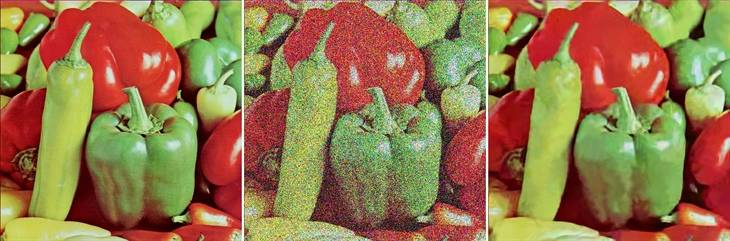 图2. 去噪样例。左:原始图片。中:附加高斯噪点后的图片,STD=100。右:使用了一个领先算法后的去噪结果——BM3D。