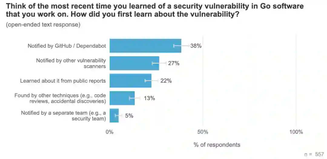 为了更好地了解大家如何检测漏洞、解决常见安全任务,我们询问受访者在过去一年中是否发现过自己的 Go 代码或依赖项中存在漏洞。对于给出肯定答案的受访者,我们又进一步提出问题,例如当时是怎么发现漏洞的、如何调查及 / 或解决,以及整个过程中哪些环节最为棘手。