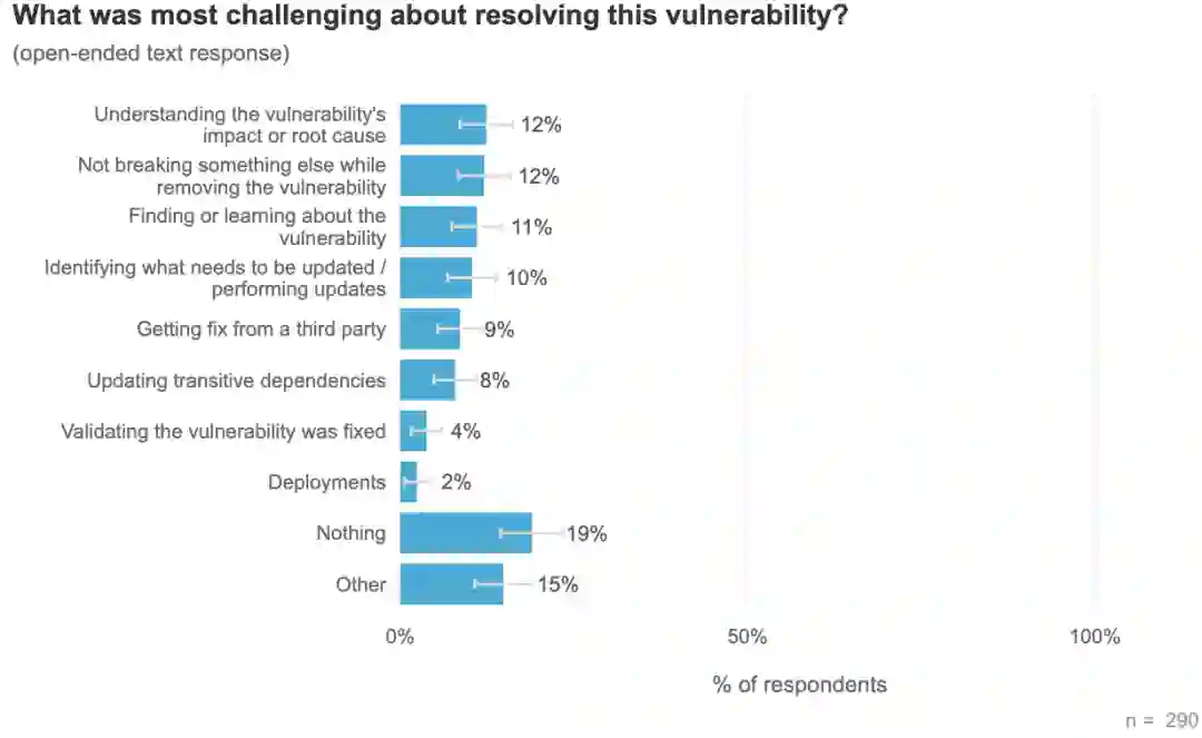 只有 12% 的受访者表示会对代码漏洞造成的潜在影响做进一步调查,这样的比例确实低得令人吃惊。为了掌握更多细节,我们还询问受访者在应对漏洞方面遇到过哪些挑战。几个主要答案的占比基本相当,包括害怕依赖项更新会影响代码执行,以及通过 go.mod 文件更新间接依赖项的难度较高等。我们也询问了一般使用哪种调查方式了解漏洞影响或探究根本原因,这 12% 愿意做进一步调查的受访者们给出了更积极的答案:其中 70% 对漏洞的潜在影响进行了调查,并发现这才是整个过程中最困难的部分。除了调查本身的难度,他们还提到这项工作通常不在项目计划之内,而且完全没有直接回报。