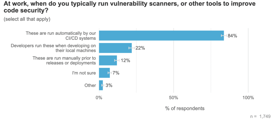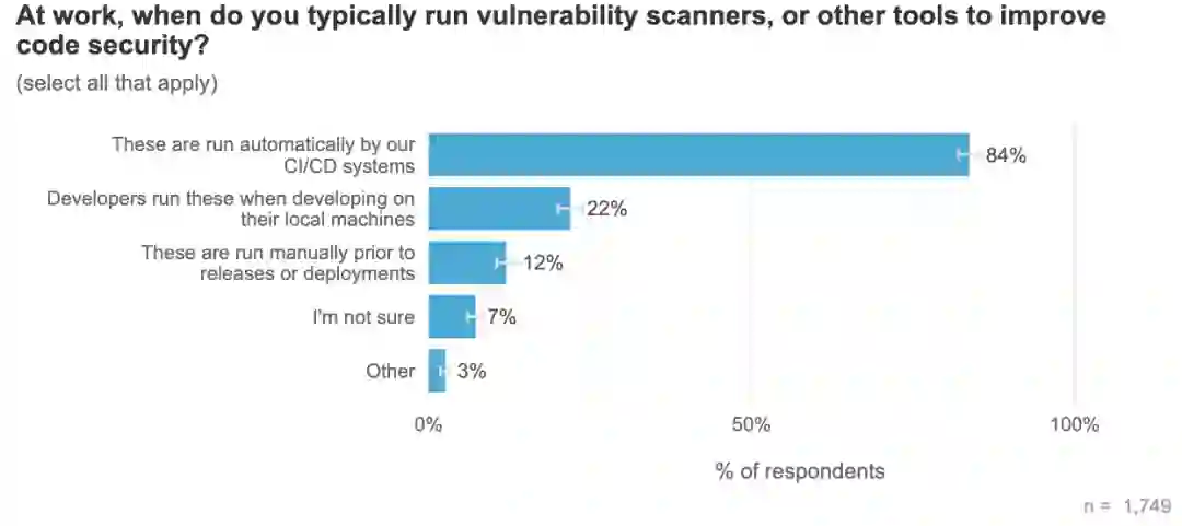 要编写出安全的 Go 软件,最大的挑战是什么?调查结果表明,虽然静态分析工具得到了广泛应用(65%),但只有少数受访者在使用这些工具发现漏洞(35%),或者以其他方式提高代码安全性(33%)。受访者们表示,安全工具主要运行在 CI/CD 过程(84%),只有少数开发者会在开发期间运行这些工具(22%)。这与我们团队进行的其他安全研究一致,即安全扫描大多集中在 CI/CD 期间,而这时才关注安全问题其实为时已晚。更理想的方法,应该是在构建之前就知晓依赖项是否存在漏洞、验证版本更新是否解决了这些漏洞。等到 CI 针对 PR 运行完整测试时,隐患往往已经难以剔除。