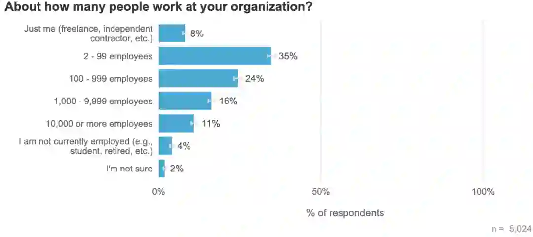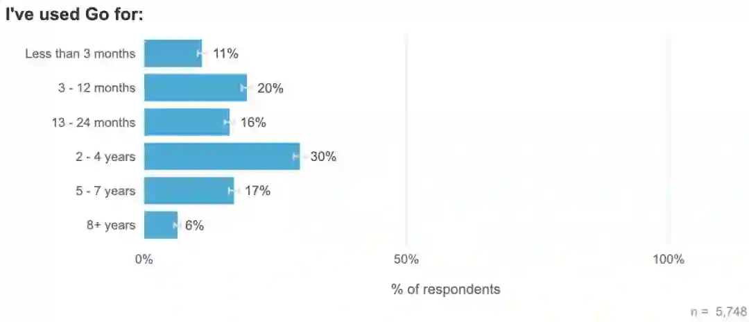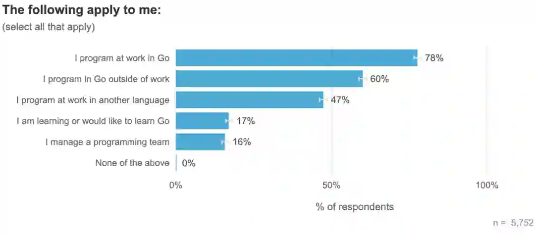 在本文中,我们将通过一系列图表来解读此番调查。所有图表均采用相同格式,标题部分是向受访者们提出的具体问题。除非另有说明,否则各问题均为单选形式,受访者只能选择其一。图表的副标题部分,会标注是否为多选问题或开放性问题。对于开放性问题,Go 团队成员认真阅读并手动整理了受访者们的意见。大家对于这类问题的回应多种多样,因此我们挑选了最具共性的前十大主题,其余主题则被归类为“其他”。