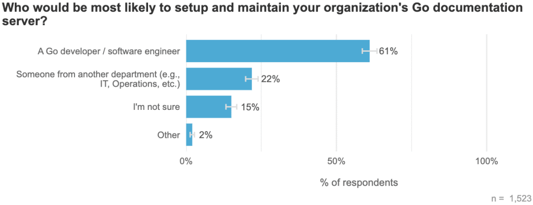 结果显示,目前最常见的内部 Go 文档查看方式是阅读代码(81%),其中约半数觉得这样就挺好,但也有 39% 认为能有内部文档服务器就更好了。我们还询问了这类服务器应该由谁配置和维护,有三分之二的受访者认为应该是软件工程师,余下三分之一觉得可以指派专门的 IT 支持或运营人员。从这个角度看,理想的文档服务器应该是那种交钥匙解决方案,或者至少不会带来过多的额外工作负担(一个人在午休时间就能维护好)。考虑到目前开发人才严重短缺的现实,这样的要求完全在情理之中。