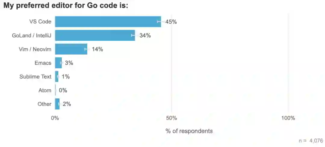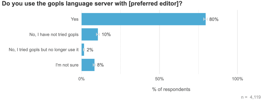 在 2021 年通过 gopls 语言服务器强化 VS Code 的 Go 支持能力之后,Go 团队一直想了解 gopls 中存在哪些使用痛点。虽然我们已经从开发者那边收到了不少反馈,但不清楚会不会有很多开发者直接禁用掉了这项功能。为了收集关于 gopls 的负面意见,我们专门统计了那些所使用的编辑器能够支持 gopls 的受访者(无论他们是否实际使用 gopls),并发现禁用比例只有 2%。而且在 VS Code 上,禁用比例更是下降至 1%。这让我们对 gopls 的表现更具信心,也期待大家在 GitHub 上提交更多关于 gopls 的问题。