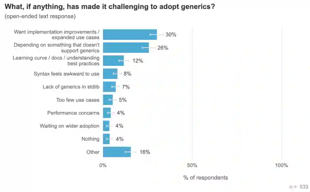 第二个理由则是某些依赖项尚不支持泛型——其中最典型的例子是 linter,此外还有仍在使用的早期 Go 版本,或者尚不提供 Go 1.18 包(26%)的 Linux 发行版等。12% 的受访者则是因为学习曲线陡峭或说明文档不充分而选择放弃。除了这些重要因素,受访者还反馈了一些相对不太常见、但仍有意见的阻碍,如下图所示。这里,我们仅列出已经在使用泛型,或者曾尝试使用泛型但未能成功的受访者。