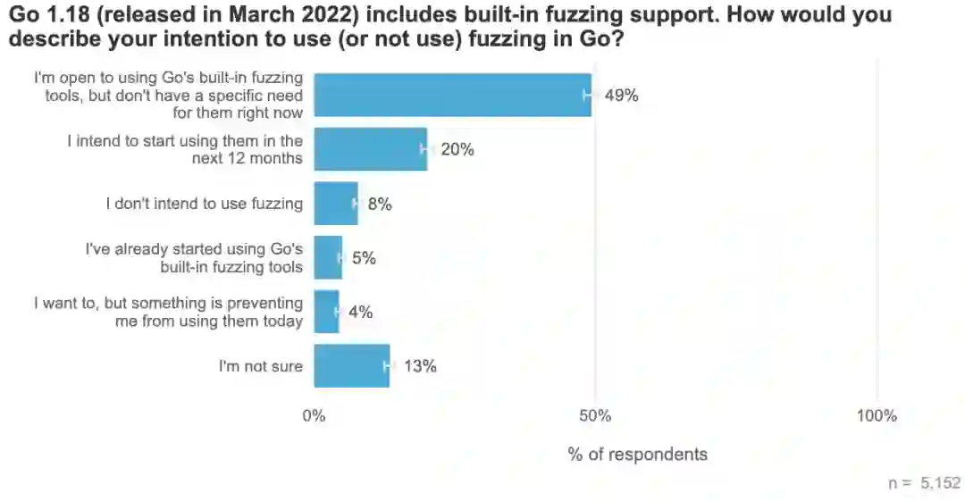 Fuzzing 对大多数 Go 开发者来说仍是新鲜事物。Go 新版本内置的模糊测试在知名度上远远不及泛型,受访者也不确定为什么或者何时需要使用模糊测试。