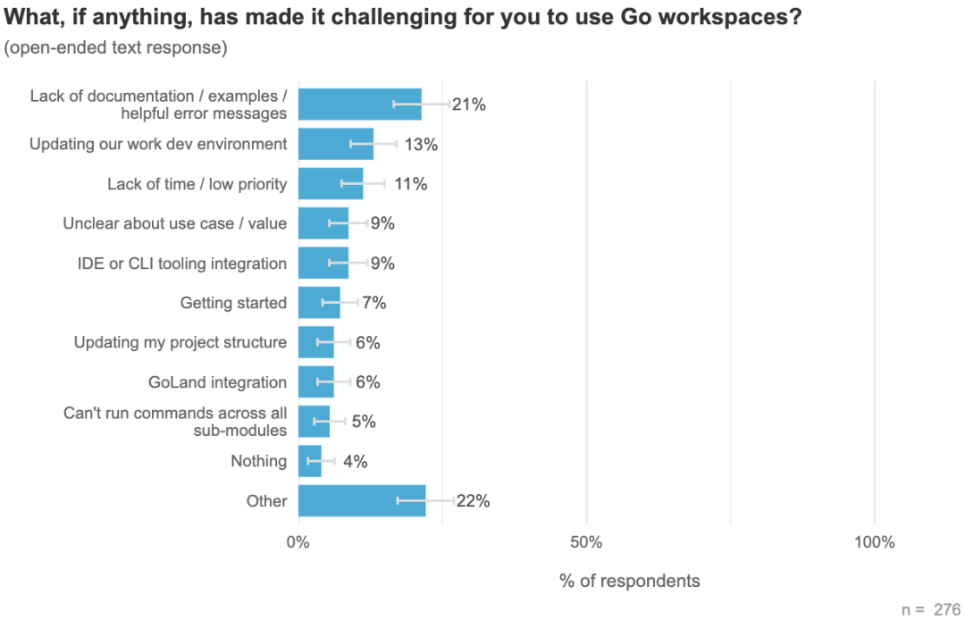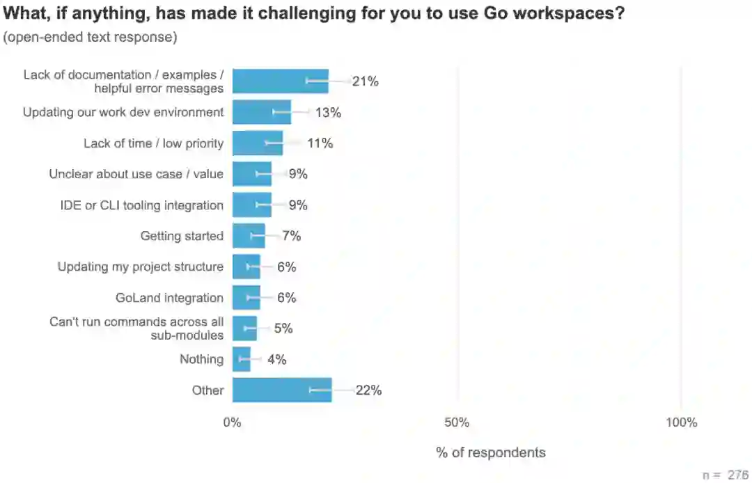 我们还发现,有 9% 的受访者曾经试用过工作区,另有 5% 表示想要尝试但最终未能进行。关于使用 Go 工作区的阻碍,位居榜首的是 go work 命令缺乏说明文档和有意义的错误消息(21%),其次则是要求重构现有 repo(13%)。与安全部分的讨论类似,同样有不少受访者给出了“没时间 / 不是优先事项”之类的理由。按照我们的理解,这意味着跟实际带来的收益相比,工作区的理解和设置门槛仍然偏高,也可能是开发者之前就已经找到了自己的解决办法。