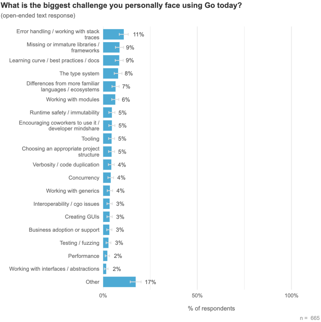 最后,我们询问了受访者过去一年来对 Go 的总体使用感受,特别是使用 Go 时遇到过的最大挑战。我们发现,93% 的受访者表示“还行”(30%)或非常满意(63%),基本与 2021 年调查得到的 92% 持平。