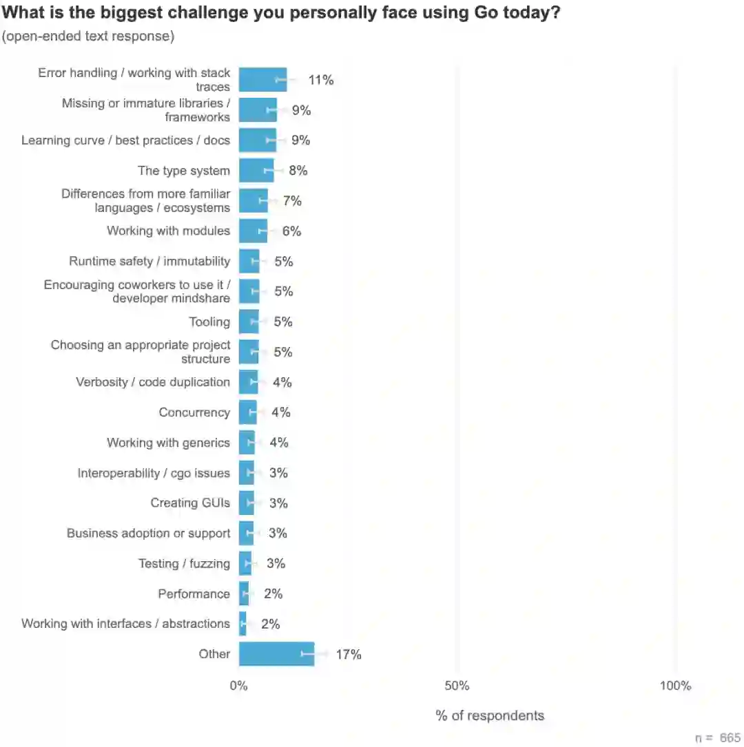 错误处理仍是个难题。随着泛型的发布,受访者在使用 Go 时面临的最大难题变成了如何处理错误。总体来看,大家对 Go 语言的满意度仍然很高,我们发现受访者使用 Go 语言的方式并没有明显变化。