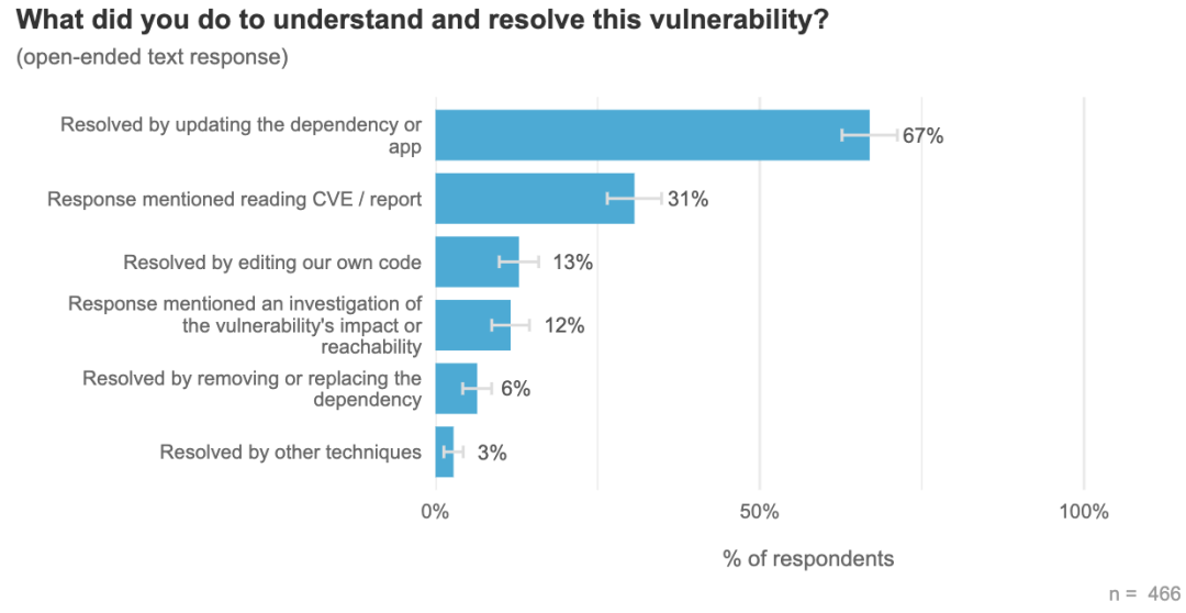 在意识到存在漏洞后,受访者们最常见的解决方法(67%)是升级相应依赖项。在使用漏洞扫描程序(专门用于检测第三方依赖项中漏洞)的受访者中,选择升级依赖项的比例则上升至 85%。近三分之一的受访者会阅读 CVE 或漏洞报告(31%),只有 12% 的受访者会进一步做深入调查,了解自己的软件是否受到影响、受到怎样的影响。