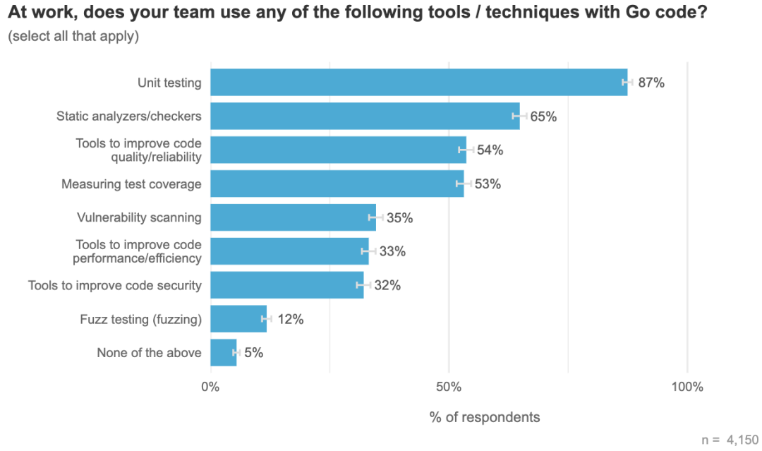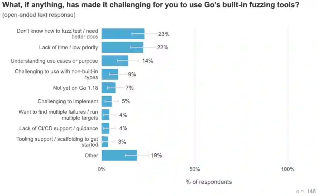 模糊测试是提高应用程序安全性的另一种好办法,但大多数受访者似乎对此还不熟悉。只有 12% 的受访者在实际工作中用过模糊测试,5% 的受访者称已经在使用 Go 内置模糊测试工具。在“为什么会感觉模糊测试难以使用”的开放性问题中,我们发现影响最大的并非技术因素:占比最高的三个答案分别是“不了解如何使用模糊测试”(23%)、“没时间进行模糊测试或者其他安全保障工作”(22%)、“没法以符合预期的方式和时间进行模糊测试”(14%)。这些发现表明,我们还需要投入精力帮助开发者了解模糊测试的价值、模糊测试要测什么,以及如何把它应用在不同的代码库当中。
