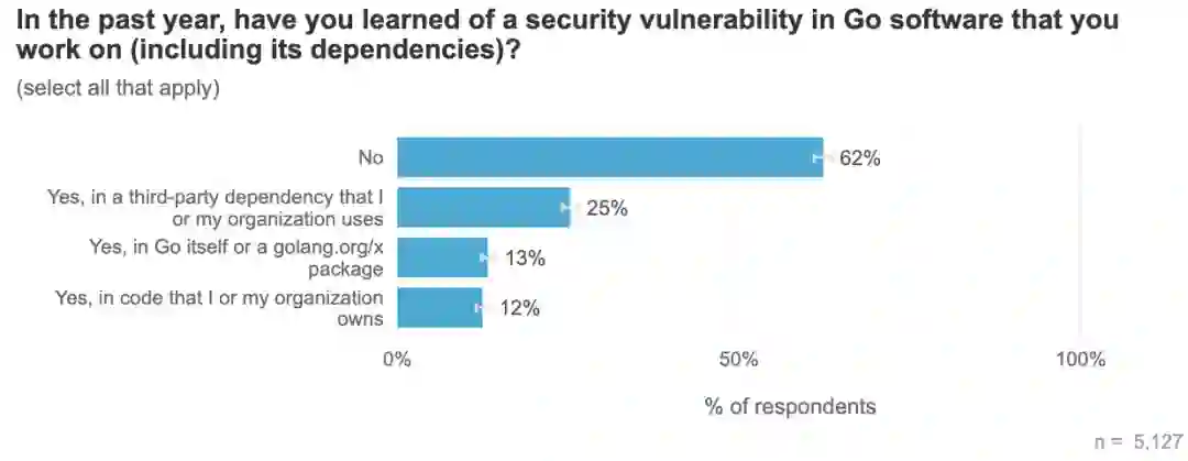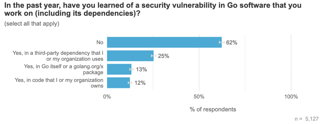 首先,我们发现漏洞扫描确有成效。四分之一的受访者表示从第三方依赖项中发现了漏洞。但实际使用漏洞扫描的受访者只占三分之一,所以在这部分群体中再统计依赖项漏洞比例时,我们发现结果从 25% 倍增至 46%。除了依赖项和 Go 自身的漏洞外,有 12% 的受访者表示发现的是自己代码中的漏洞。