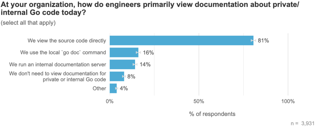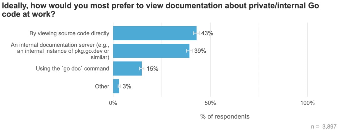 在 Go 模块发布之前,不少组织已经在通过内部文档服务器(例如支持 godoc.org 的服务器)为员工提供内部 Go 包文档。但现在,这类服务器的设置流程比以往更为复杂,我们也在考虑要不要投资来简化这个过程。因此,我们询问受访者如何查看内部 Go 模块文档,想了解这是不是他们的首选工作方式。