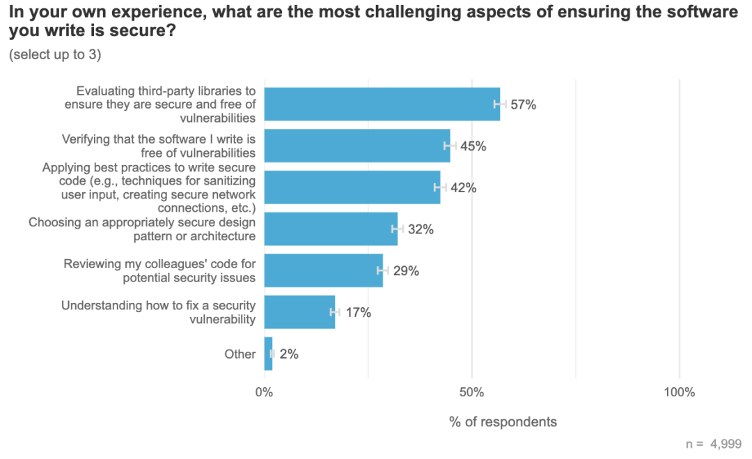 我们还向受访者询问了他们在安全开发软件时的最大挑战。目前最常见的难题是如何评估第三方库的安全性(57%),其实主题漏洞扫描器(例如 GitHub 的 dependabot 或者 Go 团队的 govulncheck)就能很好地完成任务。其他反馈意见则为新工具提供了发展空间:受访者们表示,他们在编写代码并验证成果是否存在漏洞时,往往很难全流程遵循最佳实践。