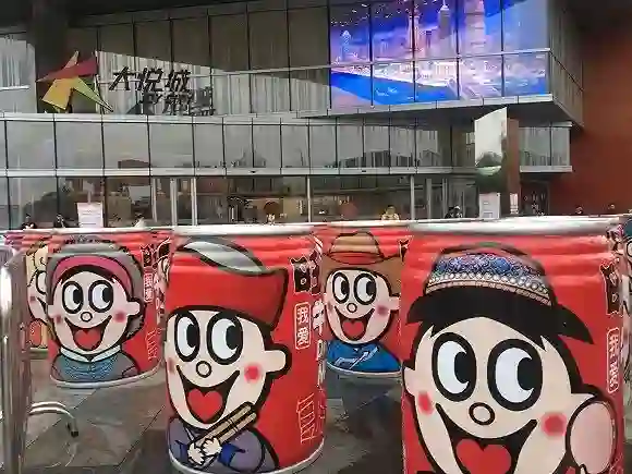 在商场正门广场,56个高1.3米的巨型旺仔牛奶罐整齐排列围成爱心形状,罐身上的旺仔穿着56个民族的服装,寓意着56个民族“旺众一心”,体现出旺旺对自身“民族品牌”的定位。在商场二楼的快闪旺旺展,以时间为轴,陈列了1983年诞生的旺旺仙贝、1984年诞生的旺旺雪饼、1994年的旺仔小馒头、1996年的旺仔牛奶……