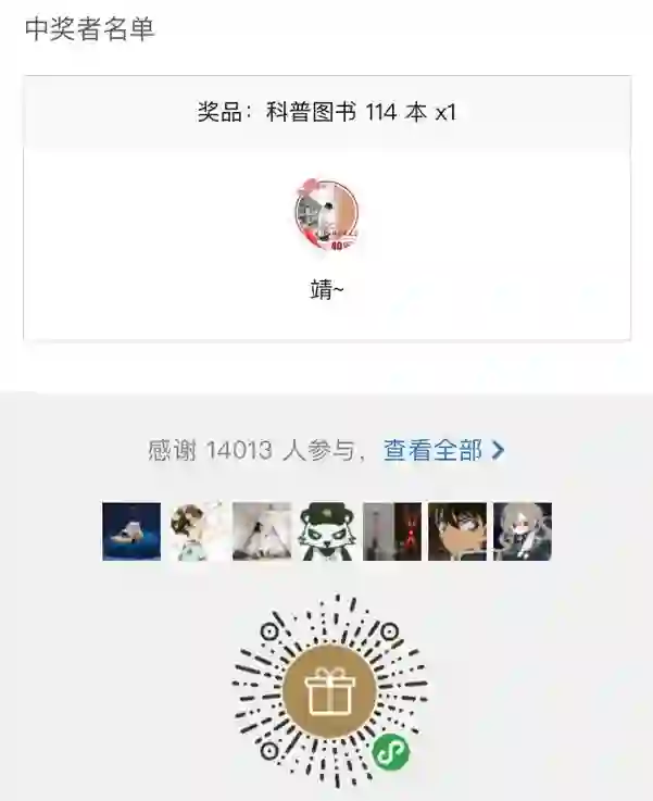 「史上最硬核的锦鲤」抽奖结果已经揭晓。经过并不紧张但很激烈的角逐和比拼,恭喜「靖~」成功地把握住了高达 0.007% 的概率,从 14013 位抽奖者中脱颖而出,获得了我们全部 114 本科普图书。请获奖者尽快在后台或者文章评论区向我们留言 ~ 不知道 Ta 有没有做好准备,腾出书柜迎接新书的到来呢?
