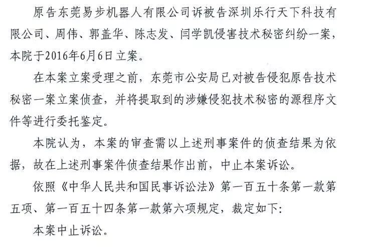 易步起诉乐行侵犯技术秘密案件中止诉讼。