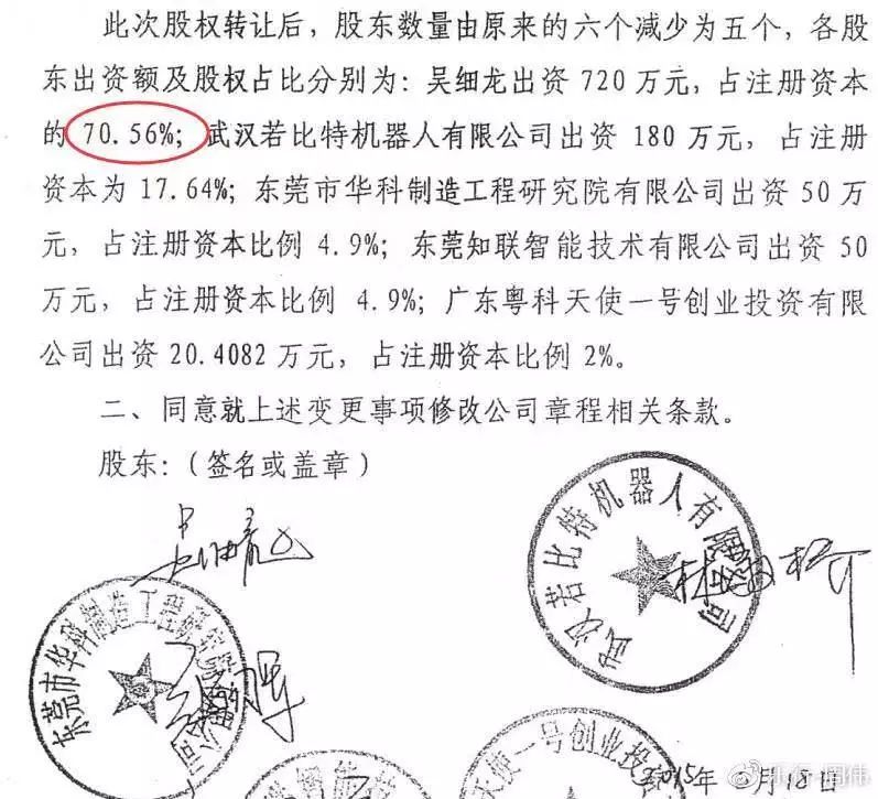 作为投资人,吴细龙提出了几个要求,首先是不想投资周伟团队原有的公司,而是希望将平衡车项目单独拿出来成立一个新的公司,他投资500万,控股60%,任董事长及法定代表人,周伟任公司总经理,任期为3年。武汉若比特机器人有限公司以技术入股,合作的相关项目知识产权归新公司;其次,公司要在东莞注册。