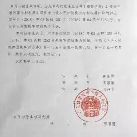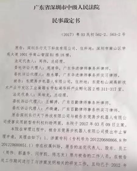 在裁定书中,乐行起诉易步专利侵权案件案件中止。