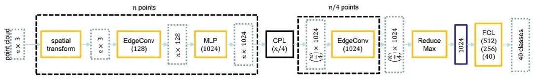 以CP-Net为核心,本文提出了一种可以应用于点云分类的深度神经网络架构,如图3所示。该网络包含了三个子网:即特征提取子网,降采样子网以及分类子网。