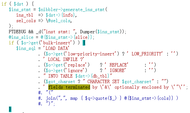 4、--bulk-insert批量插入是在远程机器以Load data方式插入的,因此要添加FIELDS TERMINATED字段分隔符。
