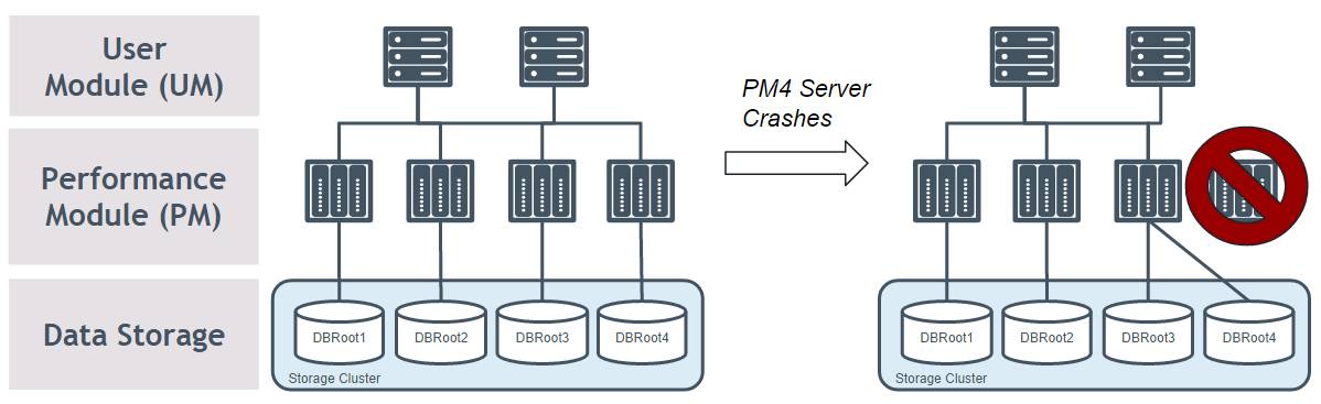借助外部存储,在PM服务器出现故障时,ColumnStore可以提供自动故障转移,这是因为给定的DBRoot存储位于发生故障的PM服务器的外部,可以重新mount挂载在另一个PM服务器上。