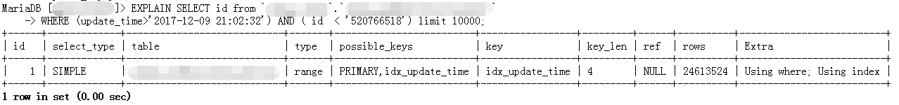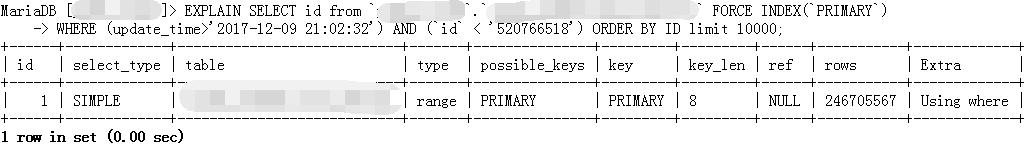 说明:因为我这边是以update_time为抽取条件,默认情况下pt-archiver生成的SQL会强制扫描主键id并对主键排序,如下面的语句: