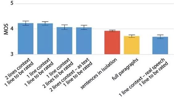 随着未来 5G 移动互联网网络的飞速发展,语音交互将有可能取代键盘和触摸成为语音输入的主导方式。但生成的语音是否逼真自然,又如何进行评价呢?传统的评价方法往往局限于单独语句,而无法对整段生成语音的效果进行全面系统的评价。近日,谷歌研究人员对评价多行文本生成语音的几种方法做了对比,并给出了不同语音呈现方法下的平均意见得分(MOS)结果。