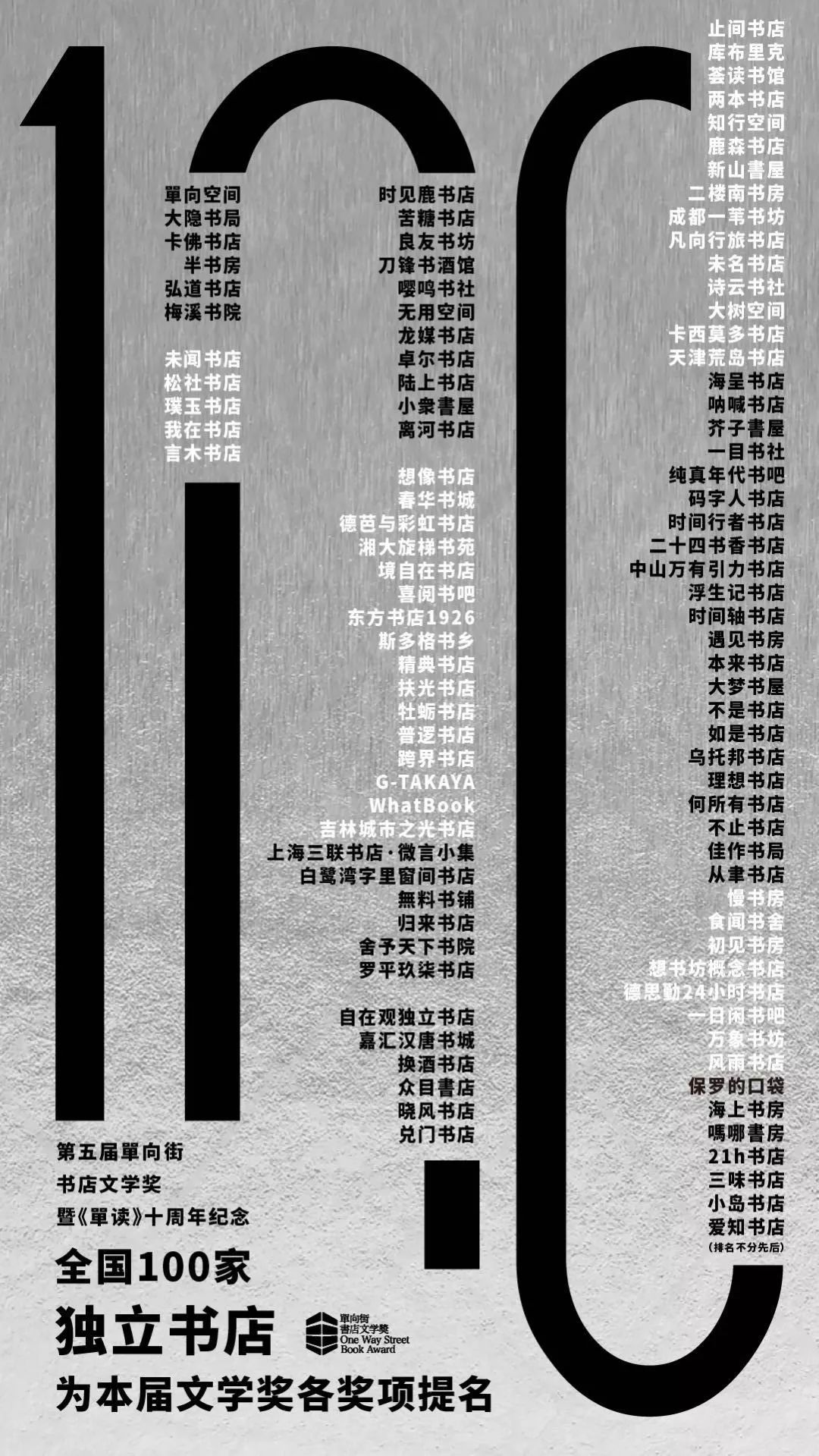 这是单向街书店文学奖的第五年,他们依然集结了全国 100 家独立书店选出这张短短的书单。这张本土书店的名单每年都有变更,有新书店的名字涌入,也有一些名字永久「停更」。