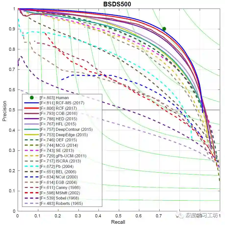 图5: 各种边缘检测算法在BSDS500数据集上的评测结果 (画图所用的代码、数据和相关说明已经公开在这里)