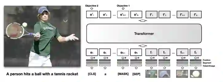 在文字端该模型的输入为正常 BERT 文字输入和整个图像特征的加和。同第二个模型相似,该模型分别在三个任务上进行预训练分别为:语言掩码、图像标签分类和图像语言匹配任务。