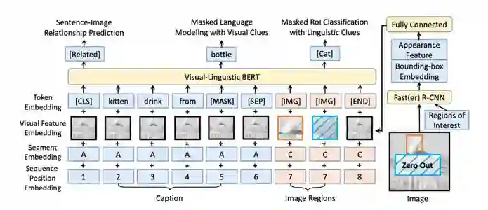 其文字部分的输入为原始的 BERT 文字输入(词向量+位置编码+片段编码)加上 Token/Image 编码来表示其是图片或文字,而图片部分的输入则是采用通过 Faster-RCNN 提取的图片区域特征加上相应的位置编码,片段编码和 Token/Image 编码(如下图右侧所示)。