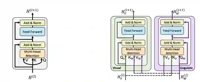 基于双流的 ViLBERT,在一开始并未直接对语言信息和图片信息进行融合,而是先各自经过 Transformer 的编码器进行编码。分流设计是基于这样一个假设,语言的理解本身比图像复杂,而且图像的输入本身就是经过 Faster-RCNN 提取的较高层次的特征,因此两者所需要的编码深度应该是不一样的。