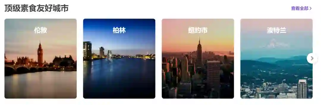 截至2021年4月,该网站评选出十大素食友好城市:伦敦、柏林、纽约、波特兰、特拉维夫、洛杉矶、华沙、多伦多、布拉格、曼谷。其中,欧洲和北美洲城市占70%。尽管素食文化在中国没有像在西方国家一样风靡,但中国的素食文化源远流长。宋代,素食文化盛行,儒释道三教的素食观使得素食与宗教结合起来。