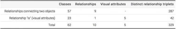 在标注中,关系与对象形成一个三词短句。(例如「桌上的啤酒,beer on table」)。属性实际上也与前者类似,例如:「桌子是木制的,table is wooden」。标注是基于图像级标签和 Open Images V4 的边界框标注。我们最初选择了 467 个短句,并在 Open Images V4 训练集上进行了标注。视觉关系检测分赛的训练集最终由 Open Images V4 标注训练集中的 329 个至少有一个实例的短句组成,包含 62 个不同的对象类。