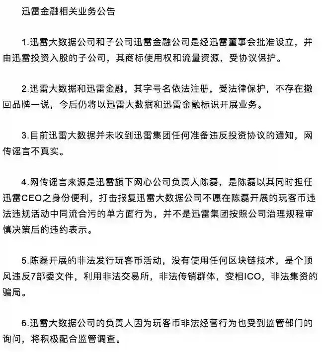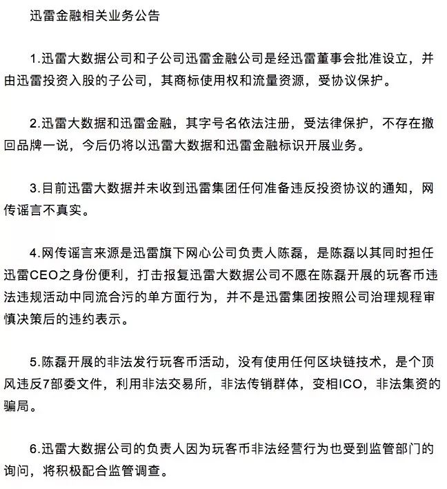 据雷锋网了解,迅雷金融在公告中表示,迅雷CEO陈磊开展的非法发行玩客币活动,没有使用任何区块链技术,是个顶风违反7部委文件,利用非法交易所,非法传销群体,变相ICO,非法集资的骗局。迅雷大数据公司的负责人因为玩客币非法经营行为也受到监管部门的询问,将积极配合监管调查。